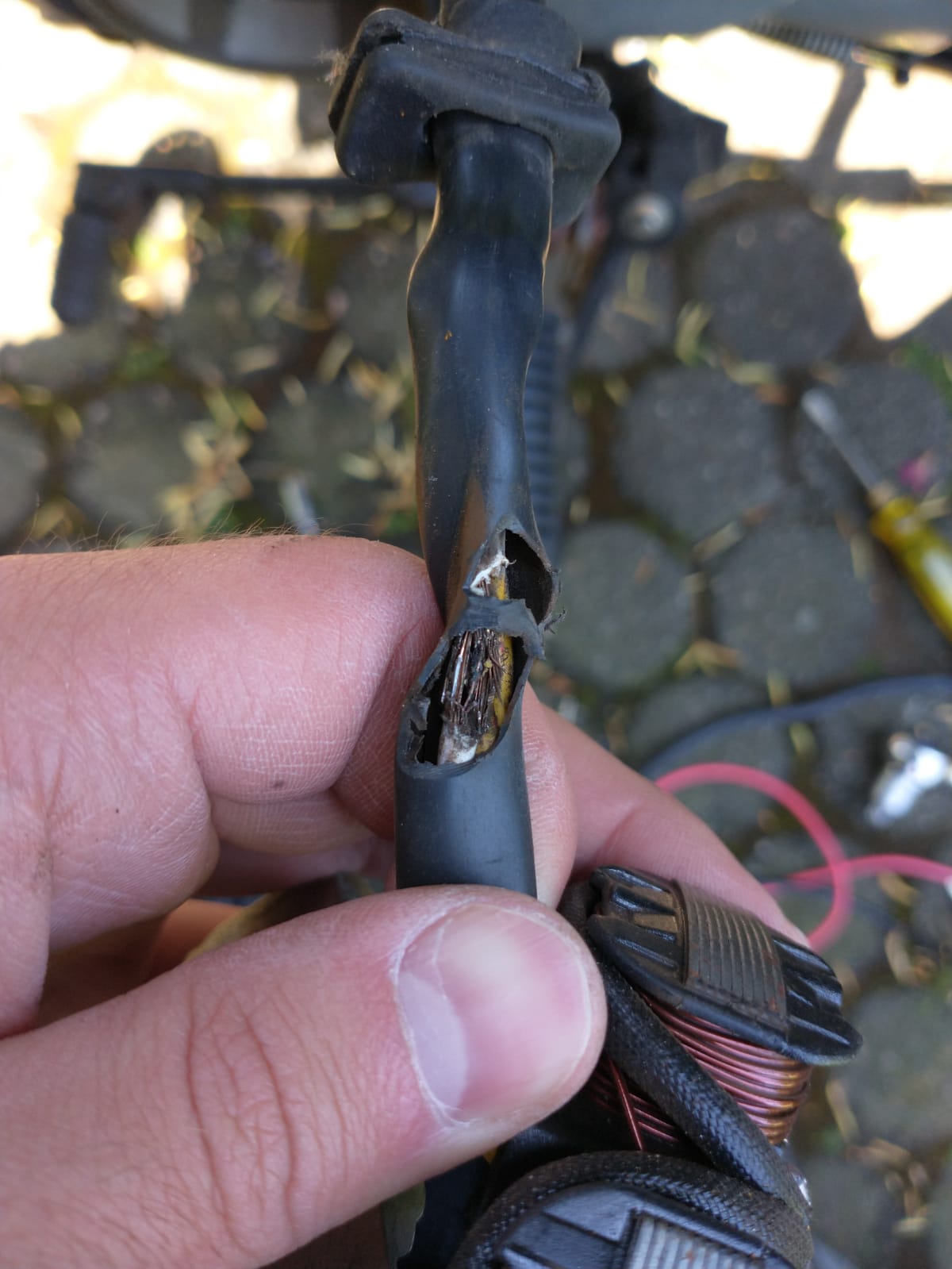 Durch Rotor durchtrennte Kabel innerhalb des Statorgehäuses | Kabel wieder zusammengelötet und mit gegebener Metallspannfeder wieder befestigt |